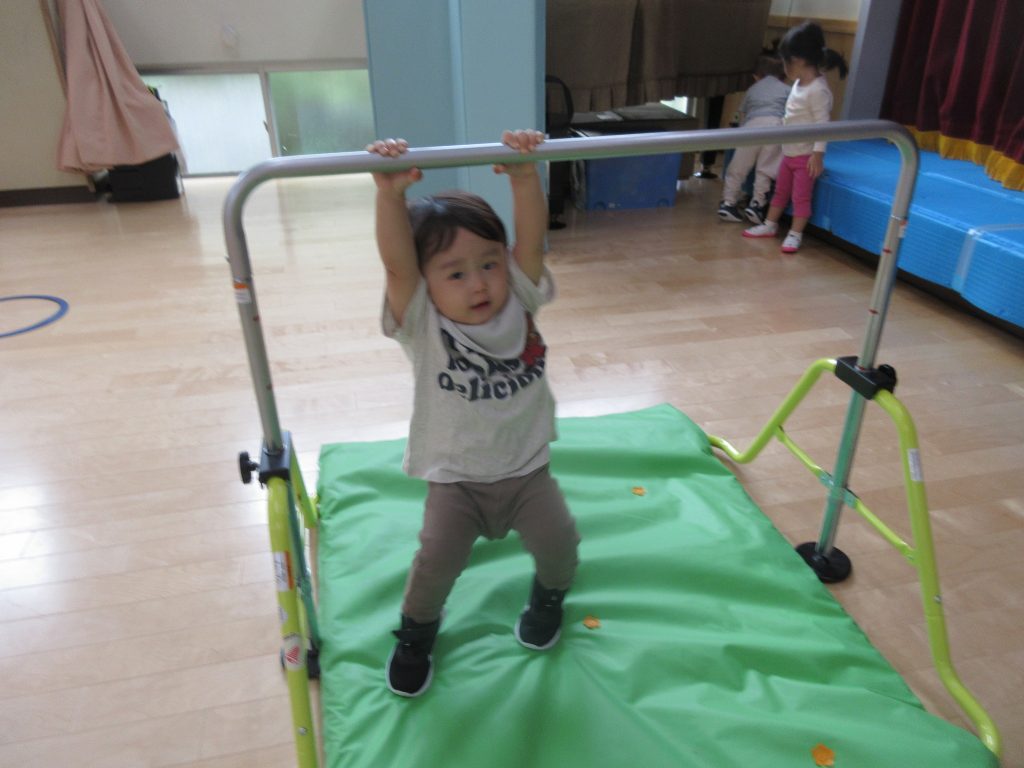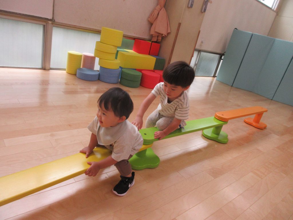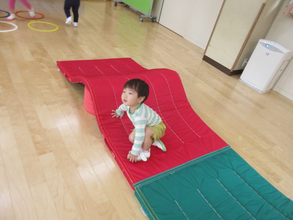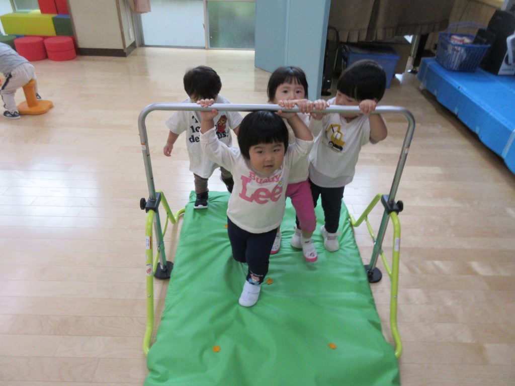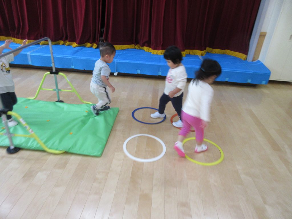 ホールでサーキット遊びをしている1歳児クラスのひよこ組さん!お友だちと一緒で楽しいね(^^♪
