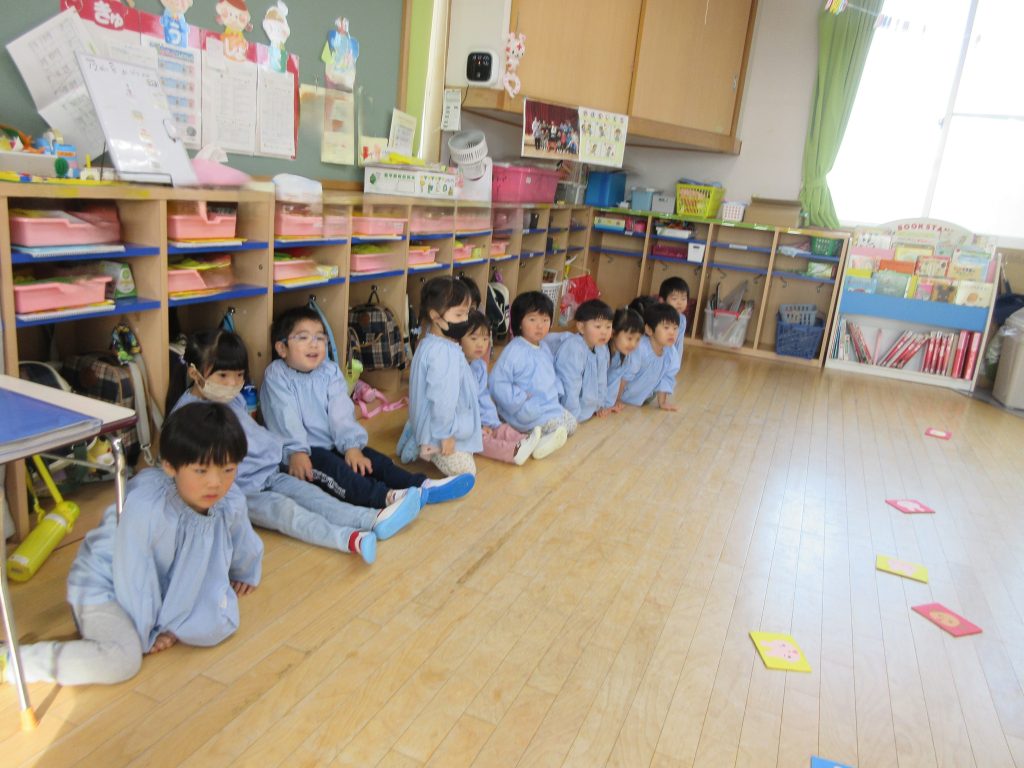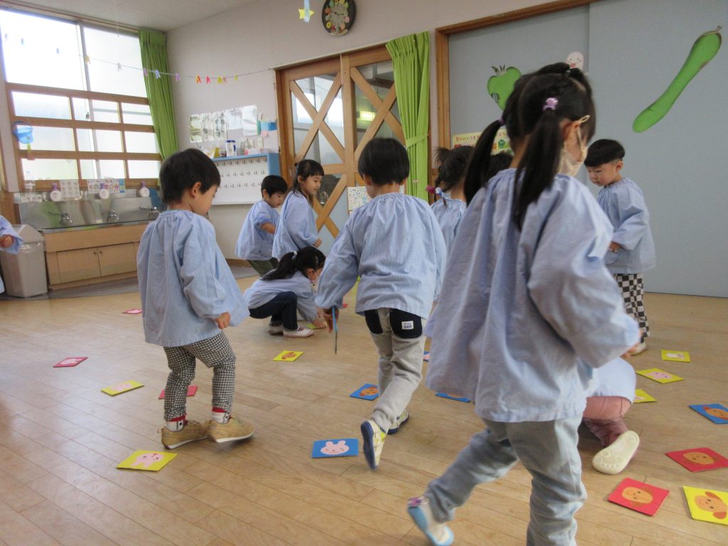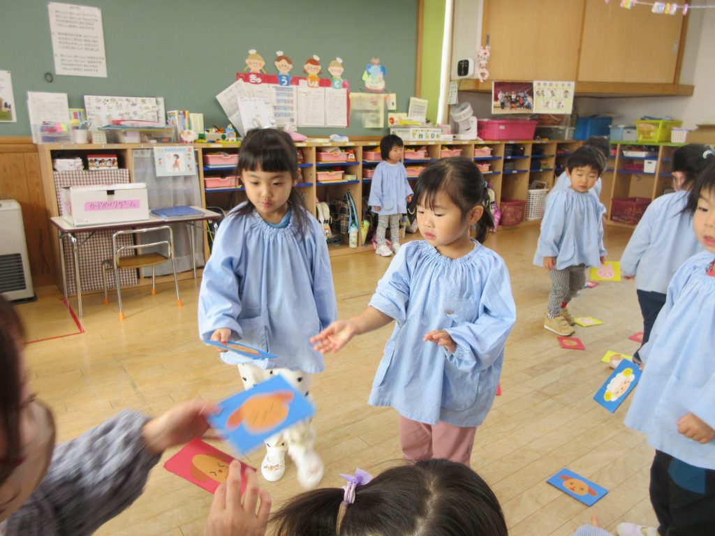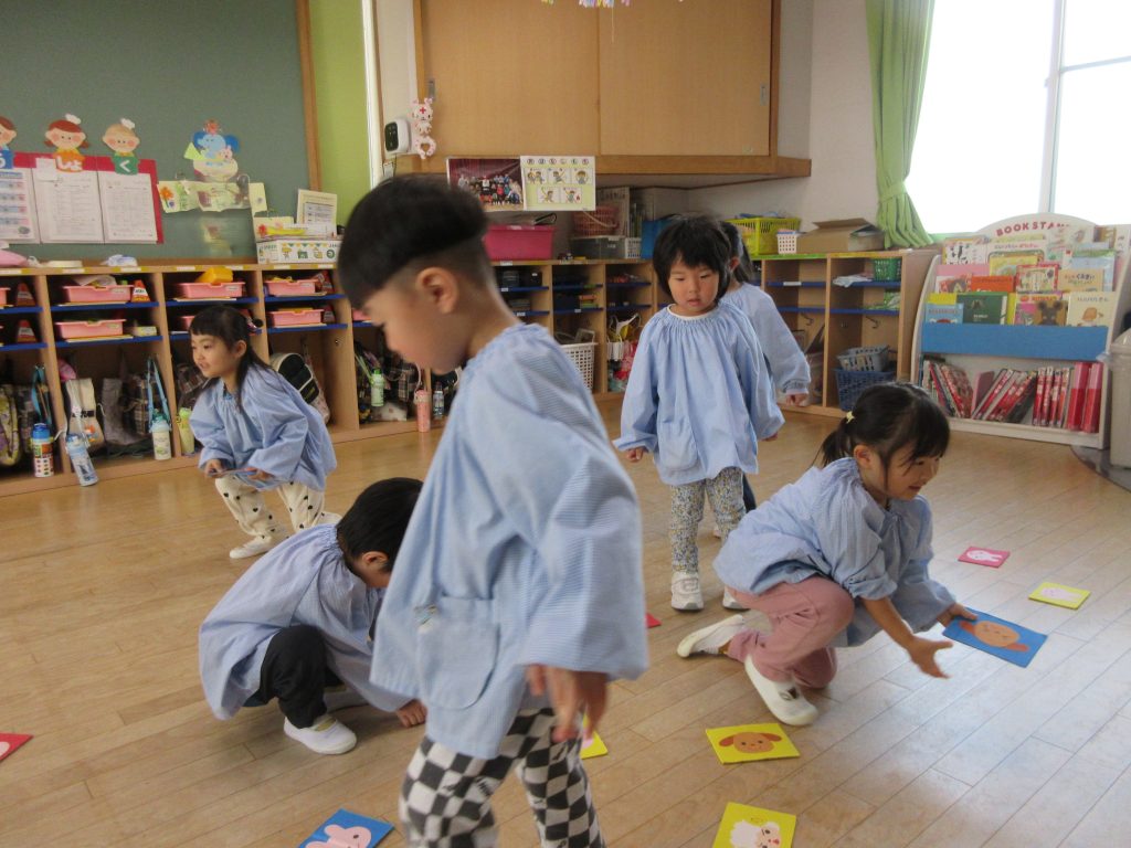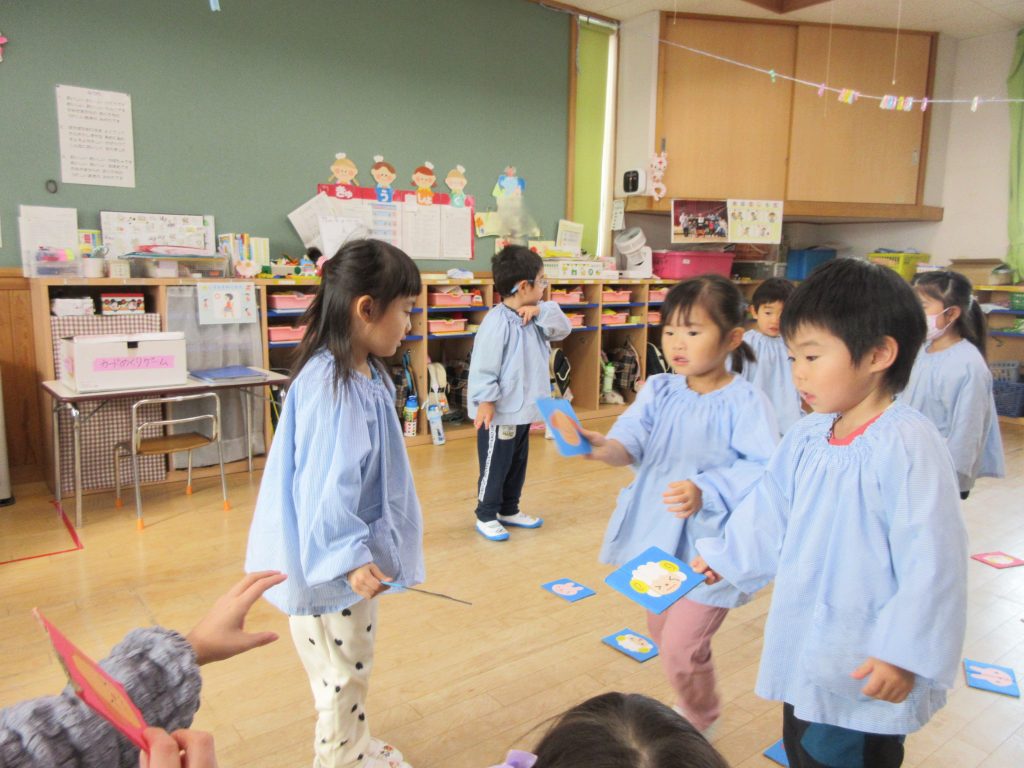 みんな大好きな、いろんな表情の顔がある動物のカードで遊んだ年少のすみれ組さん。先生が持っているカードと同じ顔のカードを探せたかな?